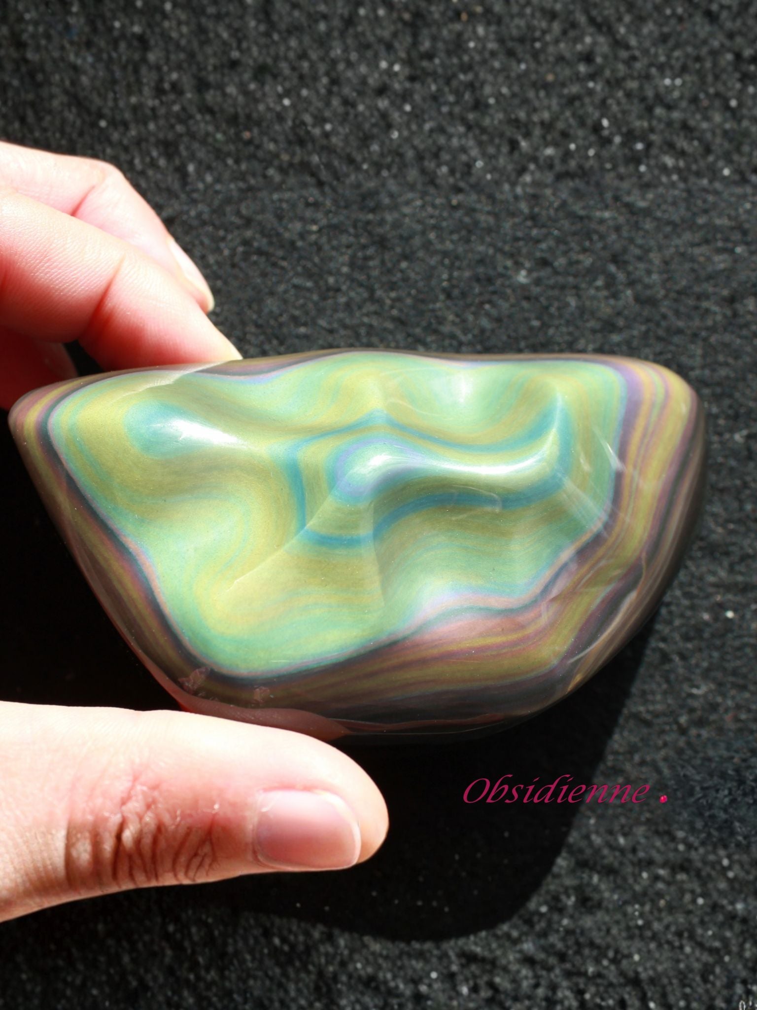 Laissez-vous surprendre par la double nature de cette Forme Libre en Obsidienne du Mexique. D'apparence sombre et mystérieuse, cette pierre se métamorphose littéralement lorsqu'elle est exposée au soleil ou sous une lampe, dévoilant des nappes de couleurs vibrantes et chatoyantes qui semblent danser sous la surface polie.