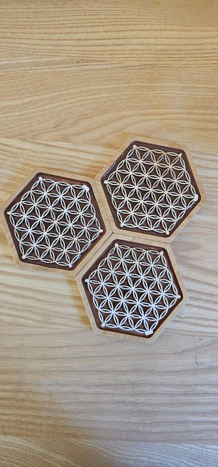 Ce sous-bock artisanal combine la chaleur naturelle du bois, la précision de la résine gravée et la protection d'un vernis alimentaire de qualité. Le motif de la Fleur de Vie, symbole ancestral d'harmonie et d'équilibre, est finement intégré dans le design.