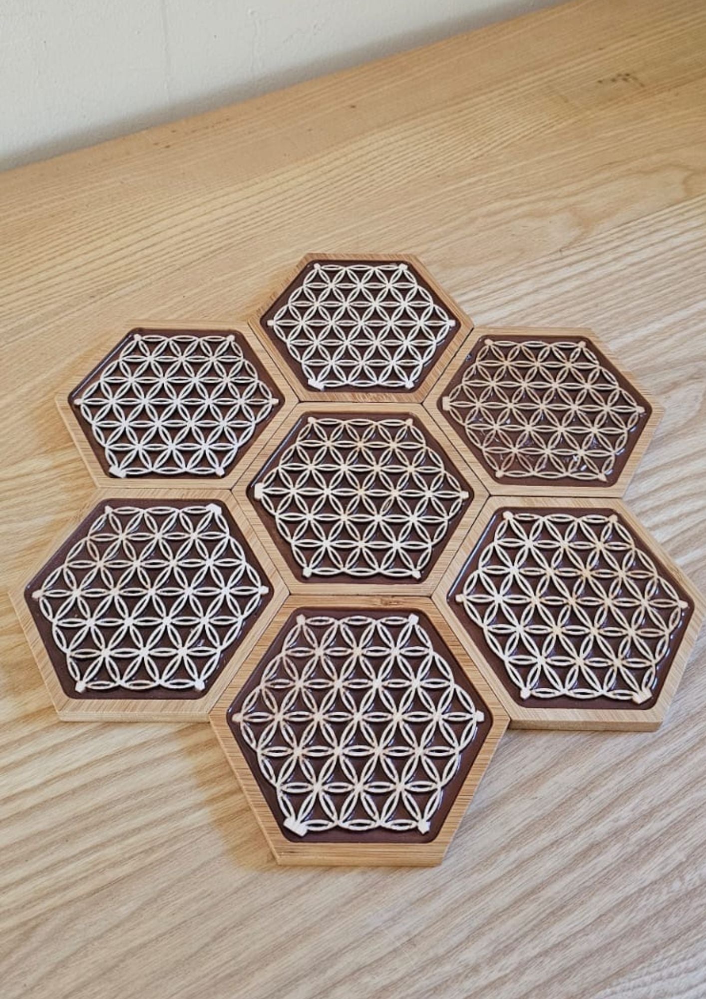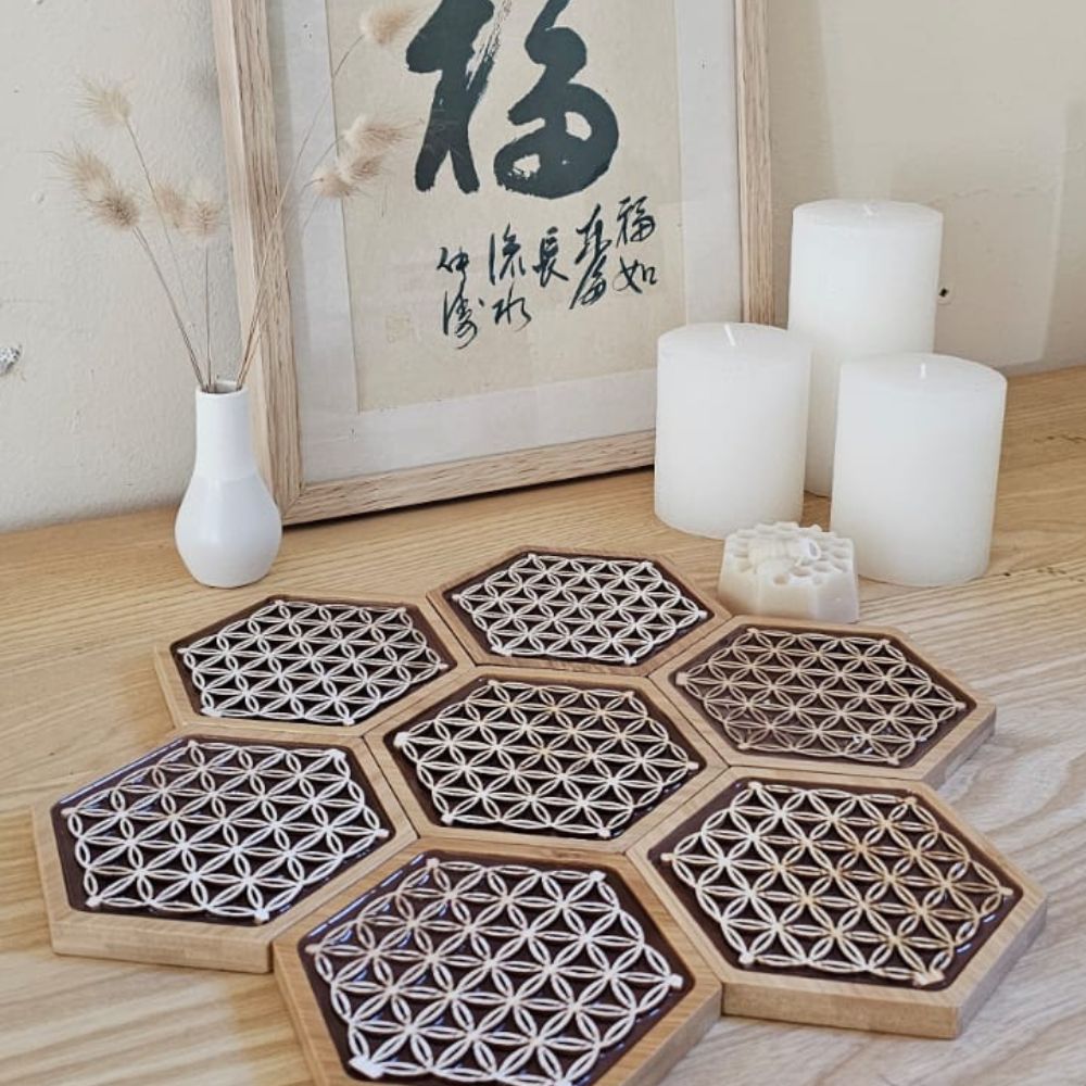 Ce sous-bock artisanal combine la chaleur naturelle du bois, la précision de la résine gravée et la protection d'un vernis alimentaire de qualité. Le motif de la Fleur de Vie, symbole ancestral d'harmonie et d'équilibre, est finement intégré dans le design.