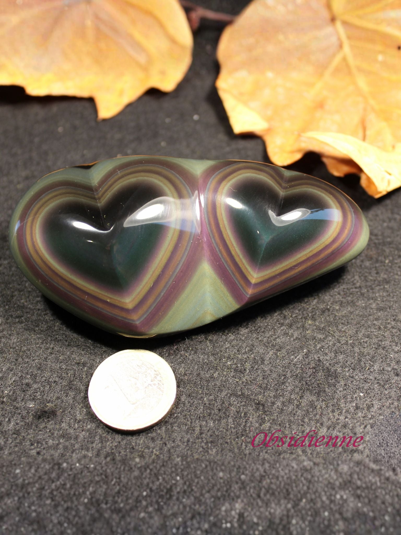 Cette pièce exceptionnelle de 174 grammes est une véritable prouesse artisanale : tailler la pierre dans le sens de ses strates naturelles pour que les reflets irisés dessinent parfaitement les deux cœurs. Sous la lumière, des ondes concentriques violettes, vertes et dorées s'animent, donnant l'impression que les cœurs battent à l'unisson.