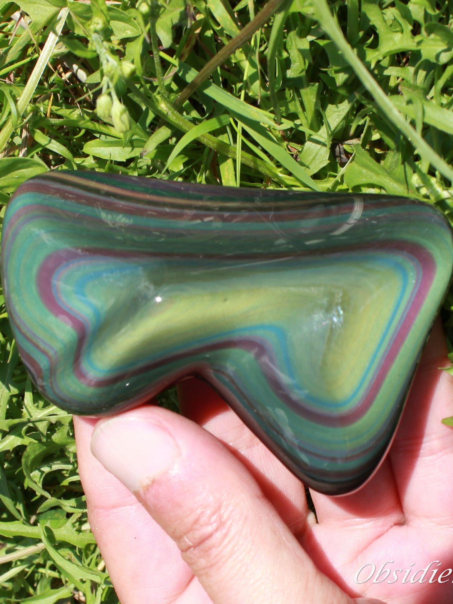 Les ondes chromatiques de cette Obsidienne, une pièce d'exception venue tout droit du Mexique. Taillée en forme libre pour préserver l'harmonie naturelle de la roche, elle dévoile, sous la lumière du soleil, un véritable tableau hypnotique composé de bandes concentriques vertes, violettes et pourpres.